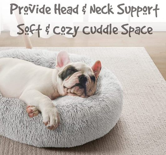 • Calming Cat Bed for Indoor Cats,Anti-Anxiety Donut round Dog Bed,Fluffy Faux Fur Washable Pet Bed for Small Medium Dogs and Cats,Grey,24In